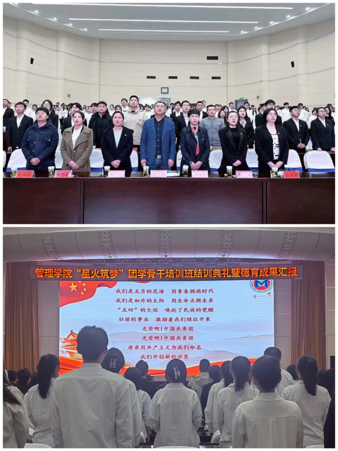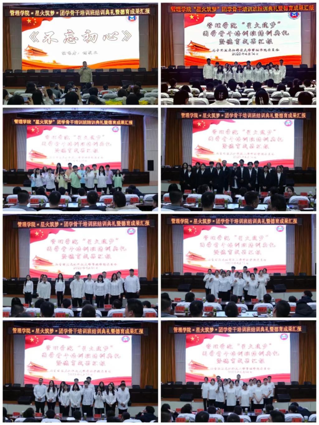 成果展示,团学引领有活力。4月14日18:00团学骨干培训班结训典礼暨德育教育成果汇报会在信报大厅举行,学工部副部长、学生处副处长张瑞、管理学院党委副书记徐海英、管理学院全体辅导员老师以及200余名团学骨干共同参加了本次活动。活动在全场齐声高唱《光荣啊,中国共青团》中拉开序幕,各组通过精彩的视频记录和节目展示进行了结训成果汇报,他们用优美动听的歌声、婀娜多姿的舞蹈、声情并茂的朗诵将管院学子的蓬勃生机与朝气展现的淋漓尽致。辅导员诸成业老师代表学工办所有老师为大家带来歌曲《不忘初心》,诸老师的演唱赢得了阵阵喝彩,为结训式掀起了一个新的高潮。
