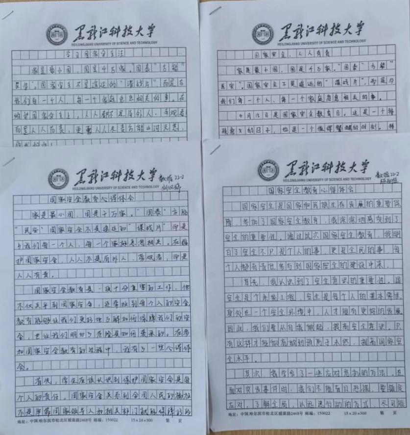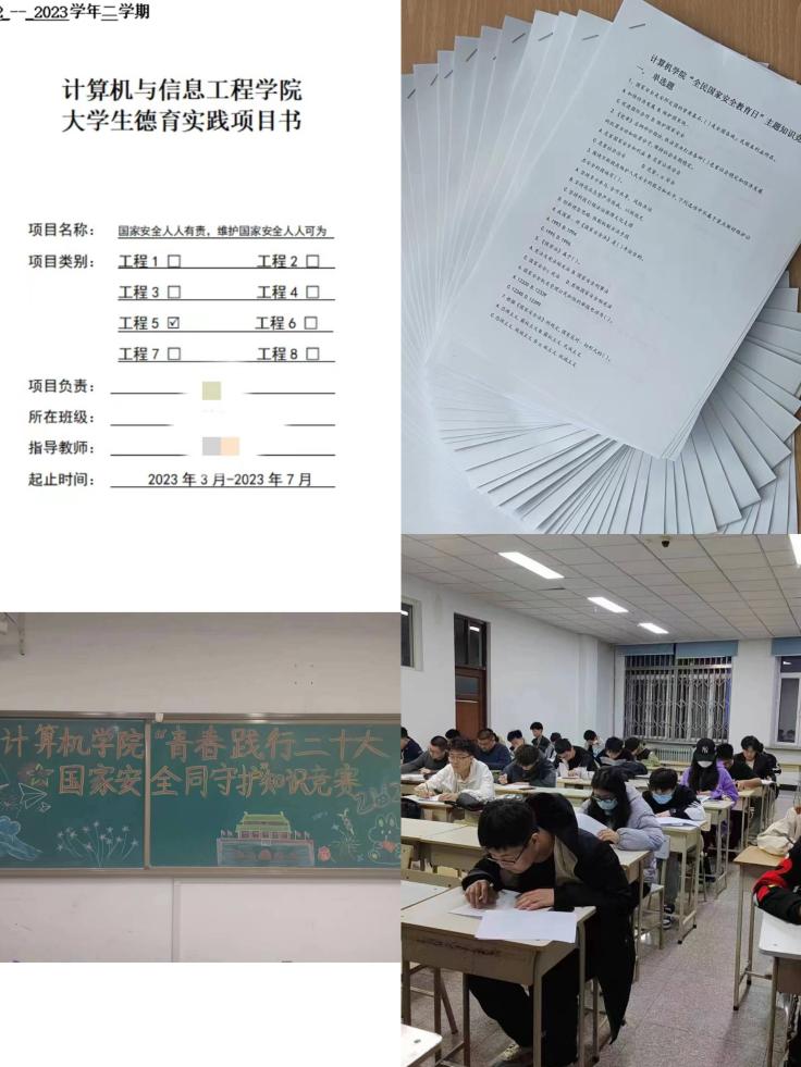 一是按照《2023年幻影手机官方网站_幻影(中国)德育实践及德育答辩工作》及《计算机学院德育实践“八项工程”》要求,围绕国家安全教育具体工作内容和要求以及典型性经验做法展开调研,申请《大学生德育实践项目》5项;二是4月15日-4月17日,学院线上线下相结合形式组织开展国家安全知识网上答题活动和“青春践行二十大,国家安全同守护”知识竞赛,通过以赛促学、以赛提能的方式调动学生参与积极性;三是学院积极探索创新国家安全教育活动内容形式,充分发挥优秀文化对青年的教育引领作用,采取手抄报、毛笔字、撰写心得、观影学习等形式开展系列活动,极大地增强了国家安全教育主题活动的感染力,吸引力,影响力。