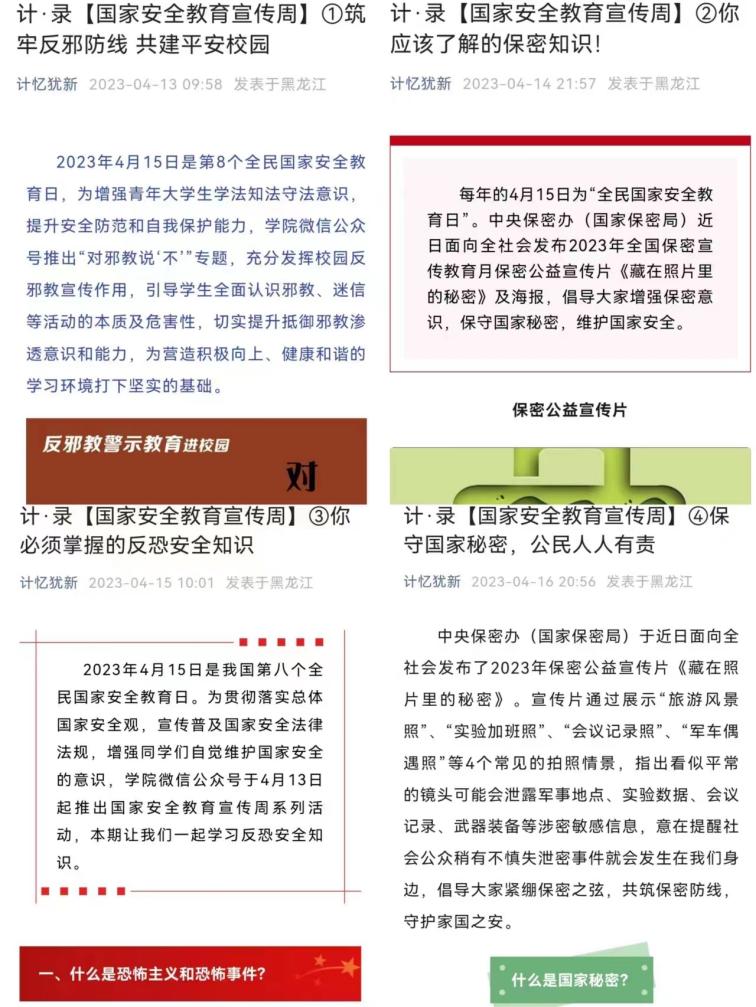 学院围绕全民国家安全教育日主题,统筹做好国家安全教育的学习宣传,发挥全媒体合力,营造浓厚的国家安全知识学习氛围。一是学院通过拍摄《挺膺担当时代新人,共筑国家安全防线》主题宣传短视频,同时积极参与中国大学生在线发起的国家安全教育主题短视频线上接力活动,向“全民国家安全教育日”献礼;二是学院依托“计忆犹新”微信公众号紧扣主题推送国家安全法律法规、专题知识,特推出“国家安全教育宣传周”专题,充分发挥校园反邪教宣传作用,了解保密知识,掌握反恐安全知识,警惕身边泄密隐患;三是学院充分发挥网络教育阵地作用,向全院师生转发国家安全教育日的相关推送、上传学习视频及海报营造宣传氛围,促使全院学生深刻理解国家安全的重要意义。