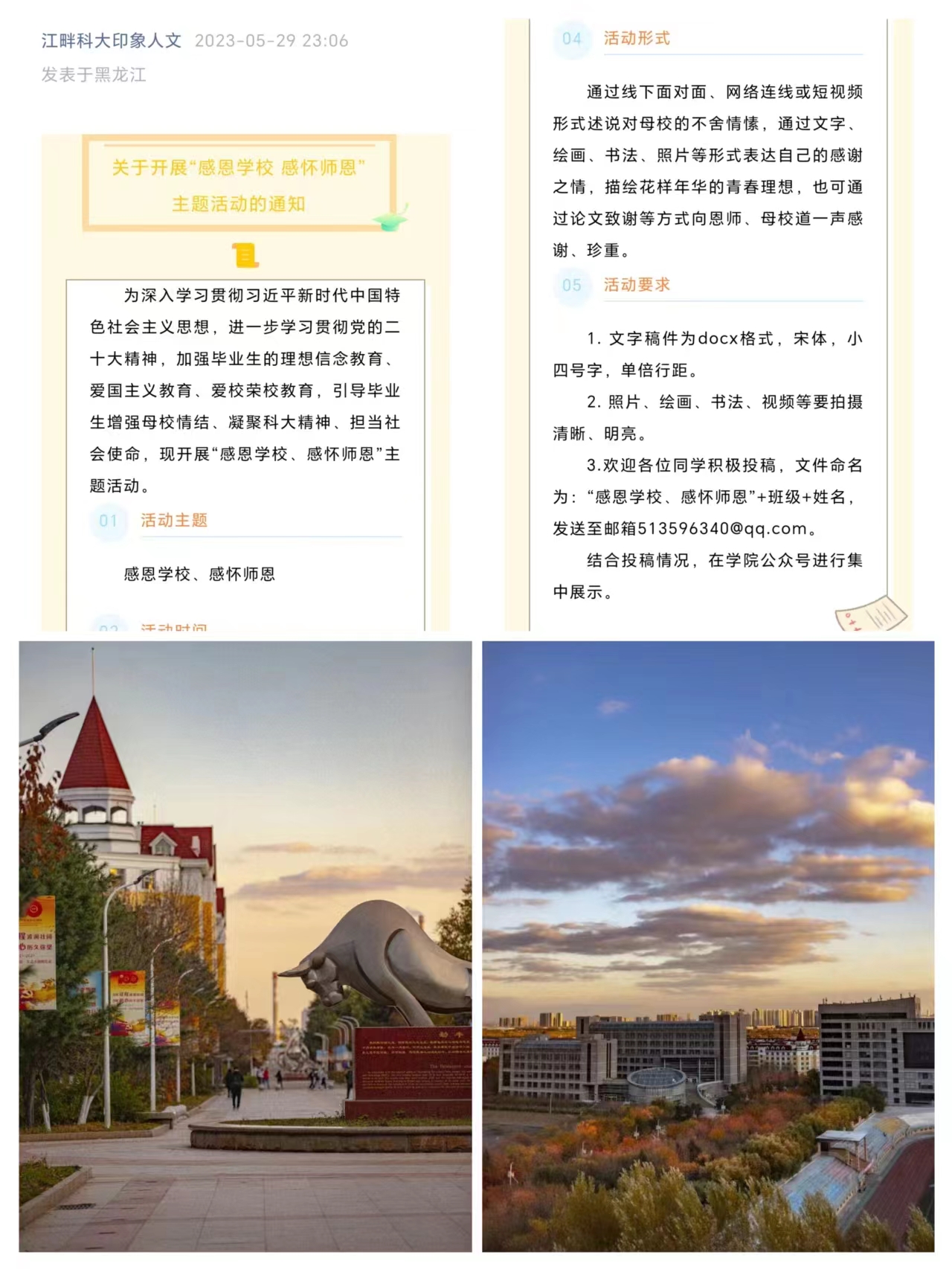 感恩表露,传递幻影手机官方网站_幻影(中国)情怀。组织毕业生通过线下面对面、网络连线、短视频等多种形式,述说对母校的不舍情愫,通过文字、绘画、照片的形式诉说对母校和恩师的深情眷恋。引导毕业生知校爱校荣校,深切感悟“厚德博学,强吾兴邦”的校训,用自己的实际行动为学校增光添彩。