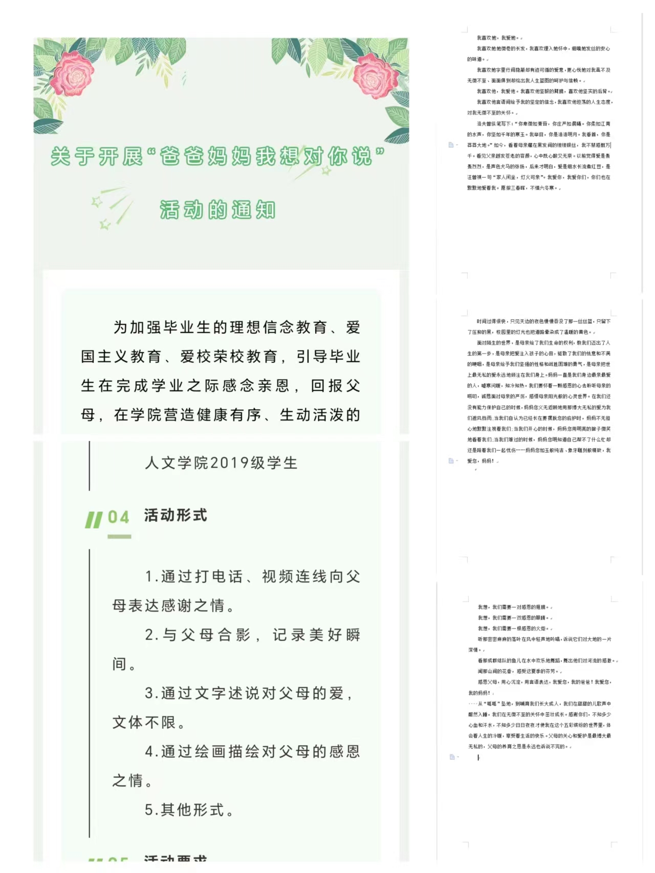 真诚回报,提升奋进力量。开展“爸爸妈妈我想对你说”活动,组织毕业生通过电话、视频、文字等多种形式与父母一同回顾大学四年生活,展望美好未来,引导毕业生积极向父母表达爱意和感激之情。