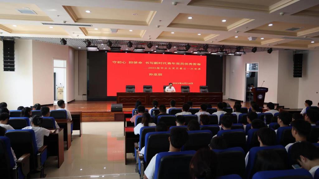 最后,孙亚朋以《守初心担使命书写新时代青年党员优秀答卷》为主题为2023届全体毕业生党员讲授了在校期间最后一堂党课。他对毕业生们四年来对学院工作的支持和配合以及为学院的发展和建设付出的努力和贡献表示感谢,并对广大毕业生党员提出四点要求:一是坚定理想信念,厚植家国情怀,永葆党员本色;二是老老实实做人,踏踏实实干事,涵养清廉底色;三是增强个人本领,矢志艰苦奋斗,提高能力成色;四是永远热爱生活,始终心怀感恩,增添人生亮色!最后为全体毕业生党员送上了最真挚的祝福。