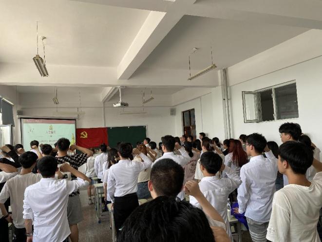 党课结束后,全体毕业生党员在2023届毕业生党员代表郝云鹏带领的带领下,高举右拳,面向鲜艳党旗,重温入党誓词。建工2023届学子以铮铮誓言昭示党员初心,以高亢之声言明报国之志。