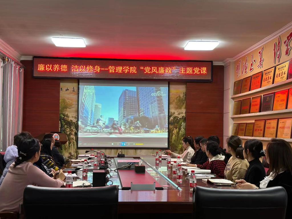 按照《管理学院2023年全面从严治党暨党风廉政建设宣传月活动实施方案》,为全面学习宣传贯彻党的二十大精神,推进落实新时代廉洁文化建设的意见,以永远在路上的清醒和坚定,深化推进全面从严治党,进一步增强党员干部纪律意识和规矩意识,持续营造风清气正、干事创业的良好政治生态,10月18日,管理学院党委书记何景洋以“廉以养德 洁以修身”为主题,为学院党委领导班子成员、全体党支部书记、教研室主任讲授了一堂主题鲜明、发人深省的专题党课。