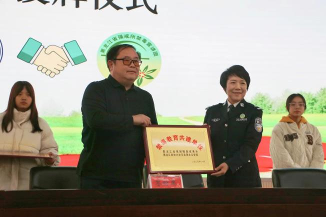 签约仪式暨宣讲活动在信息楼报告厅正式展开。双方首先举行了共建单位签约授牌仪式,马克思主义学院院长冯德军与省强戒所政委于晓平共同签署了共建协议,并互相授牌。