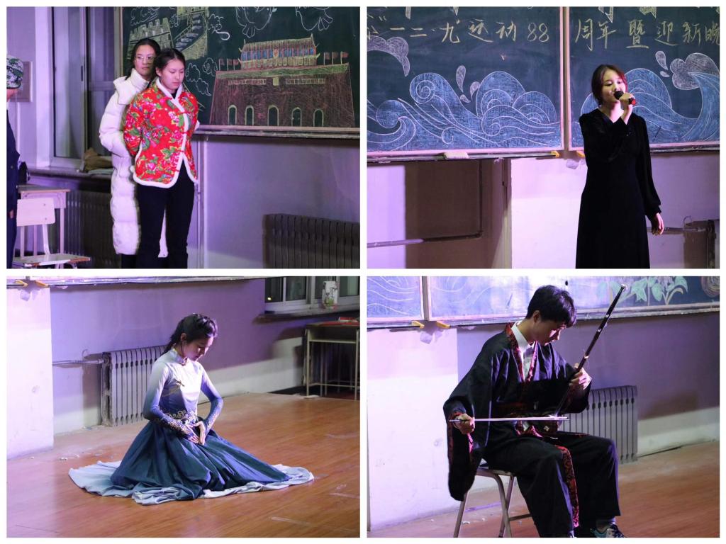 由马克思主义学院主席团成员、学生骨干集体演唱的《星辰大海》将晚会激情点燃。情景剧《亮剑》以细腻的表演充分展现红旗飘飘,军号响,剑已出鞘,雷鸣电闪!舞蹈《日不落》愿世界一切的美好,永远是旭日东升,永远的日不落。歌曲《天下无双》带来的是爱横亘千古,是爱举世无双。在独舞《乌兰巴托的夜》中感受寂静与力量的交织,共同寻找着内心的方向,感受着生命的脉动。秦筝吐绝调,玉柱扬清曲,一曲二胡演奏《兰亭序》带大家体会中华文化的源远流长、博大精深。情景剧《这盛世如你所愿》以穿越对话的形式带大家回到那个硝烟弥漫的年代,一同看那个崭新的中国。英雄是民族最闪亮的坐标,手语《追光者》带领大家一起致敬所有为党和人民的伟大事业捐躯的英烈们。这是一次关于2023年的温暖回望,送给所有一起走过2023年的人。吉他合唱《星星在唱歌》让大家一同告别旧时光,拥抱每一个温柔又闪亮的日子。许下青春的誓言,见证未来的绽放,坚定的目光、滚烫的初心,每一位马院青年用铿锵誓言诉说着“青春无悔”,誓言回响在教室、激荡在每一个人的心中。晚会在“强国有我 青春担当”的声声感召下落下帷幕。