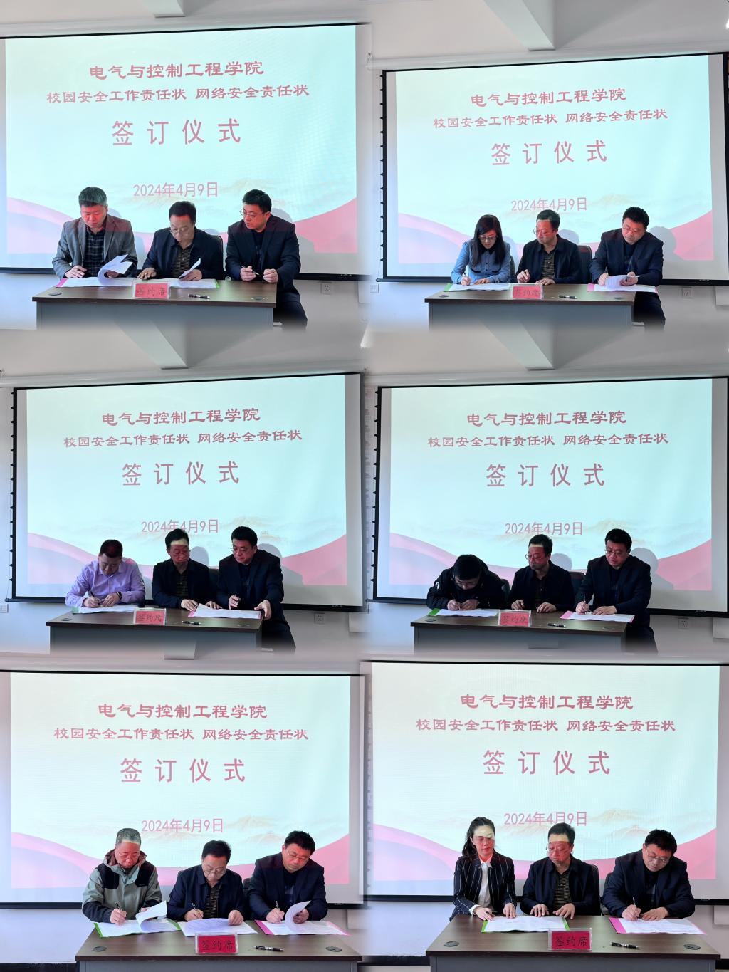 会上学院党委书记李鹏银、院长苏勋文分别与学院党委副书记侯树成、副院长刘丹丹、李忠勤,副处级辅导员韩大伟、各部门签订校园安全责任状和网络安全责任状。会后,各位副处级领导与分管的部门签订了校园安全工作责任状和网络安全责任状。