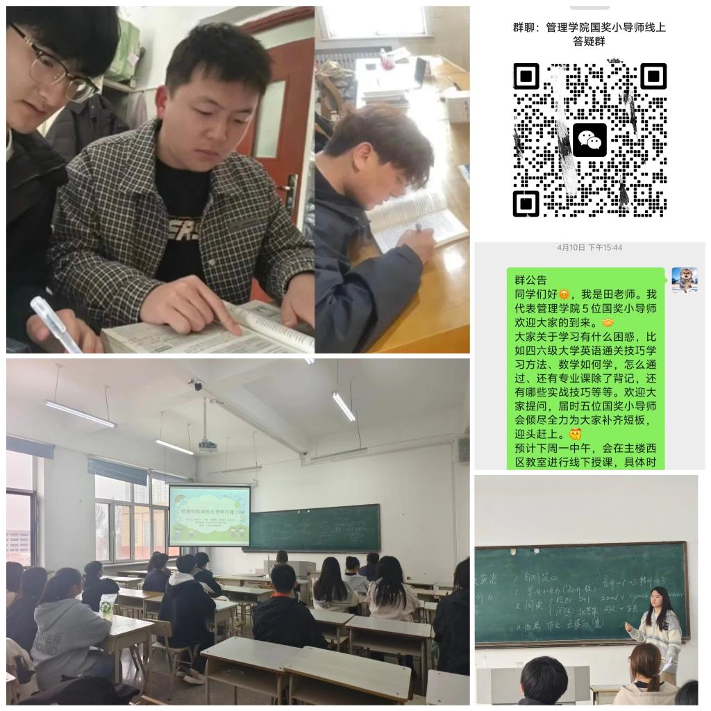 拓宽服务渠道,以“先优”带学风。管理学院持续加强朋辈帮扶,拓宽服务渠道,让学习成绩优秀且责任感强的学生党员与学习困难学生结成对子,帮助他们寻找合适的学习方法、讲解知识难点,督促他们养成良好的学习习惯。4月10日,学院成立国奖小导师讲师团为学业预警学生组建线上答疑群并定期开展线下集中授课,授课内容涵盖线性代数、高等数学、大学英语等八门学科课程,受到同学们的一致好评,真正做到以学铸魂、以学促行、以学正风。