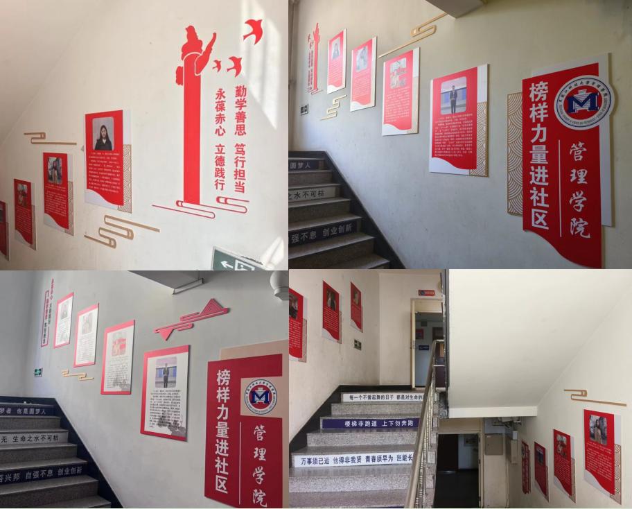 打造社区文化,以“榜样”育学风。为切实落实教育部关于推进“一站式”学生社区综合管理模式建设工作要求,加快把学生社区打造成为学生党建前沿阵地、“三全育人”实践园地、智慧服务创新基地、平安校园样板高地,充分发挥寝室文化育人功能,为学生成长成才创造良好条件。管理学院于4月3日完成五个学生公寓的10组榜样力量进社区系列文化墙建设,深入推进管理学院“一站式”学生社区建设,并以此为起点将学生社区建设成“思想教育、文化交流、行为养成”的基地家园,激发榜样力量新效能。