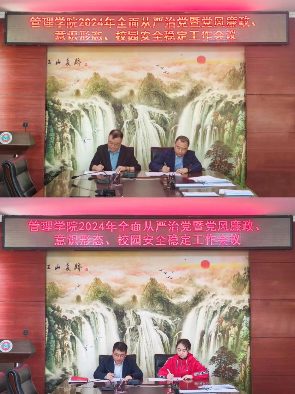 洪亮院长对学院2024年全面从严治党暨意识形态工作责任书和校园安全稳定责任区的划分情况进行了解读和说明,要求全院党员、干部要牢牢守住校园安全稳定底线,认真落实好学校安全隐患排查百日会战专项行动,以高水平安全推动学院高质量发展。随后,何景洋代表学院党委与班子成员、教师和学生党支部书记签订《2024年管理学院全面从严治党和意识形态工作责任书》。洪亮代表学院党政领导与班子成员、系(办、中心)负责人、辅导员签订了《2024年管理学院校园安全稳定工作责任书》。