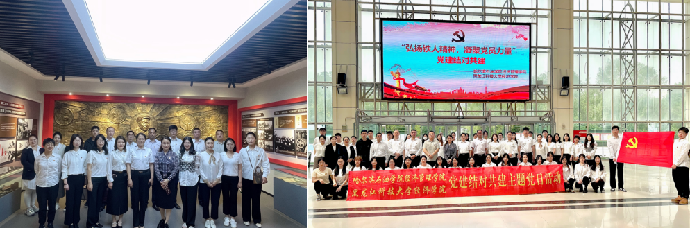 按照学校下发的《关于开展庆祝建党103周年系列活动的通知》,幻影手机官方网站_幻影(中国)经济学院与哈尔滨石油学院经济管理学院联合开展“弘扬铁人精神 凝聚党员力量”党建结对共建主题党日活动。经济学院党委书记雷金屹、党委副书记邬丽群、哈尔滨石油学院经济管理学院党总支书记吴东爽、党总支副书记陈志勇,以及两校60余名党员师生参加本次活动。