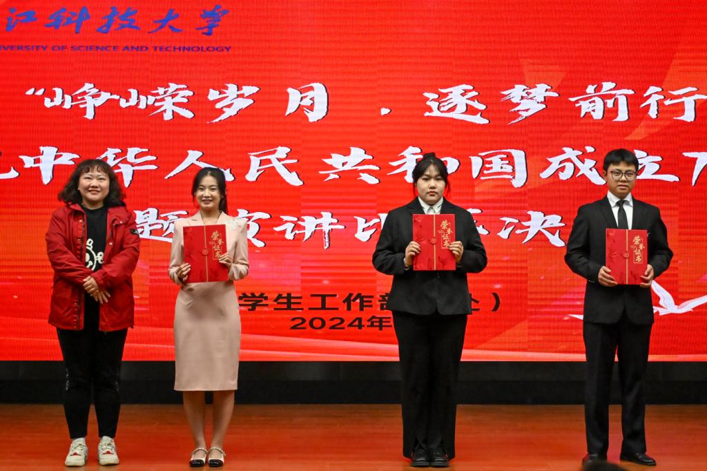 为庆祝中华人民共和国成立75周年,不断巩固拓展大学生爱国主义教育成果,按照《关于在全体学生中开展“挺膺担当砺青春 逐梦复兴新征途”庆祝中华人民共和国成立75周年主题教育活动的通知》相关要求,积极引导大学生弘扬爱国主义精神和勇于担当、主动作为的进取精神,激励大学生为实现“中华民族伟大复兴的中国梦”不懈奋斗,10月23日下午,学工部(处)在朝阳楼0131举办“峥嵘岁月 逐梦前行”庆祝中华人民共和国成立75周年主题演讲比赛决赛。