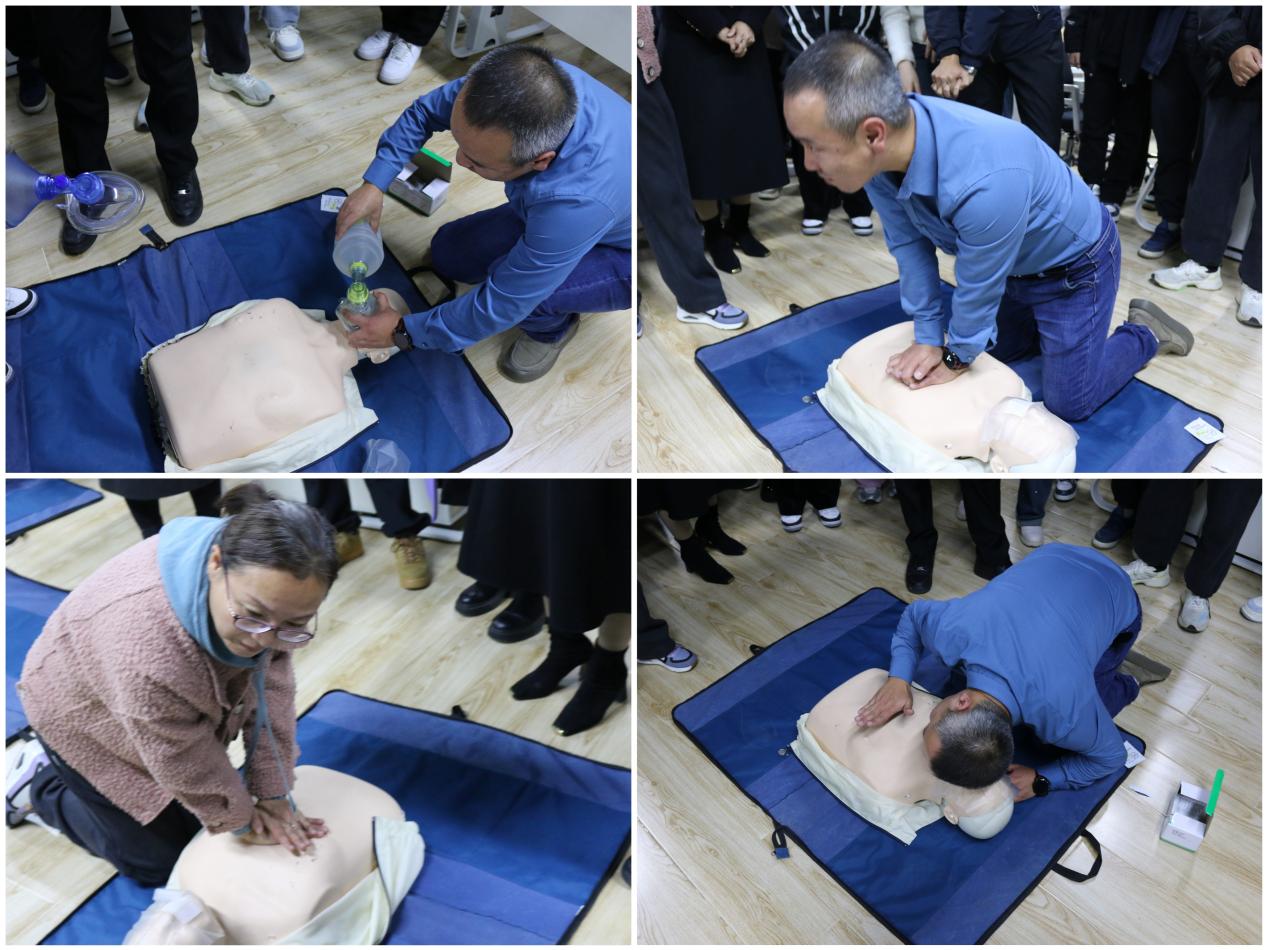 培训中,闫峰采用理论知识讲解和救护技能实操相结合的方式,就应急救护的原则、心肺复苏的具体操作及AED除颤仪的使用方法、气道异物梗阻的处理方法(海姆立克急救法)等进行了细致讲解,帮助大家明确当应急事件发生时,如何第一时间采取有效处理。