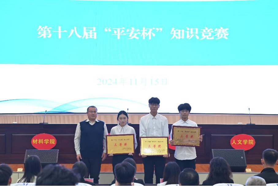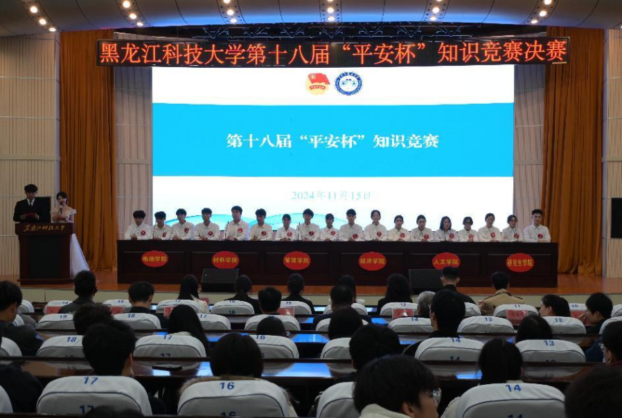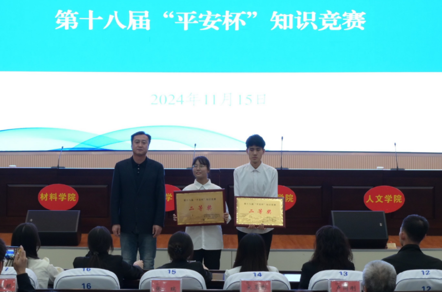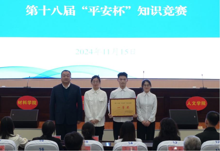 为提升全校师生的安全防范意识和自我保护能力,激发学生关注校园安全、参与校园安全工作的积极性和主动性,夯实公共安全基础,共建平安和谐校园。11月15日晚,由校团委、学生处、保卫处主办,校学生会承办的第十八届“平安杯”知识竞赛决赛在办公楼报告厅举办,校团委书记宋玉彬、学生处副处长张瑞,全体专职团干部,部分学生代表300余人观看比赛。