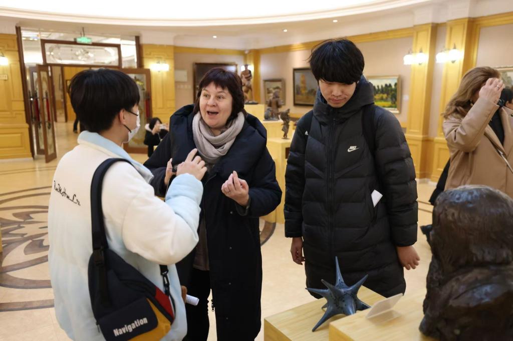 活动开始,韩建民馆长简要介绍了馆藏情况,盛情邀请师生欣赏俄罗斯艺术家的精美画作。外国语学院党委书记张海涛对韩建民馆长的热情接待表示感谢!他强调,本次参观活动是一次审美教育,能让学生感知美、体验美、理解美、实践美、创造美,有助于激发创新思维和想象力,提升学生的审美和人文素养,是一次非常有益的教学拓展实践。学生们化身专业讲解员,用中俄双语流利地向大家讲述一幅幅精美绝伦的画作。