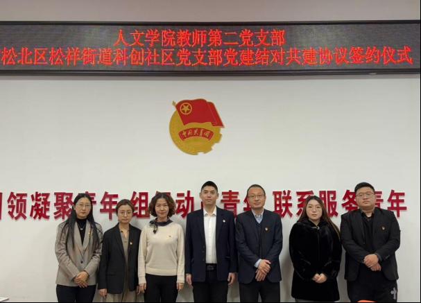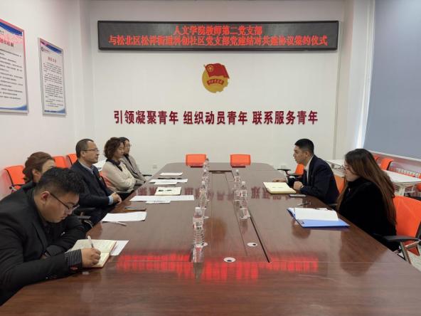 为深入贯彻落实党的二十大和二十届三中全会精神,创新基层党建工作载体,提高基层党建工作水平,推动校社党建工作协同发展,12月12日下午,人文学院教师第二党支部与松北区松祥街道科创社区党支部党建结对共建签约仪式在朝阳楼0122室举行。科创社区党支部书记孙长园、社区干事崔祎航,学院党委书记孙晓辉、校级“双带头人”教师党支部书记“强国行”专项行动团队负责人王翌佳、教师第二党支部党员代表刘丽晶、就业辅导员颜华辰参加会议,会议由党委副书记杨凤娟主持。