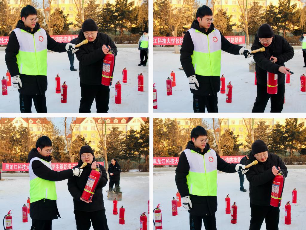 认真聆听孙老师讲解及观摩操作流程后,学生骨干分成四个小组进行了实践演练。演练中同学们按步骤拉出灭火器插销、拔出喷嘴保险栓,右手提住灭火器,左手捏住喷雾管,亲身体验使用灭火器灭火过程。通过现场讲解与实践操作结合,同学们不仅学会了如何正确使用灭火器,还掌握了灭火器的使用技巧和注意事项,能够切实地应用到实践当中去。