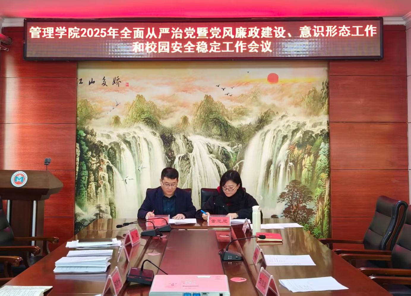 为深入贯彻落实好学校2025年全面从严治党工作会议和安全工作会议精神,层层压紧压实全面从严治党和校园安全稳定主体责任,以高质量党建引领学院高质量发展。4月2日上午,管理学院在三楼会议室召开2025年全面从严治党暨党风廉政建设、意识形态工作和校园安全稳定工作会议。会议由学院党委书记何景洋主持,学院党政班子成员、各系(办、中心)主任、教师和学生党支部书记、全体辅导员参加了会议。