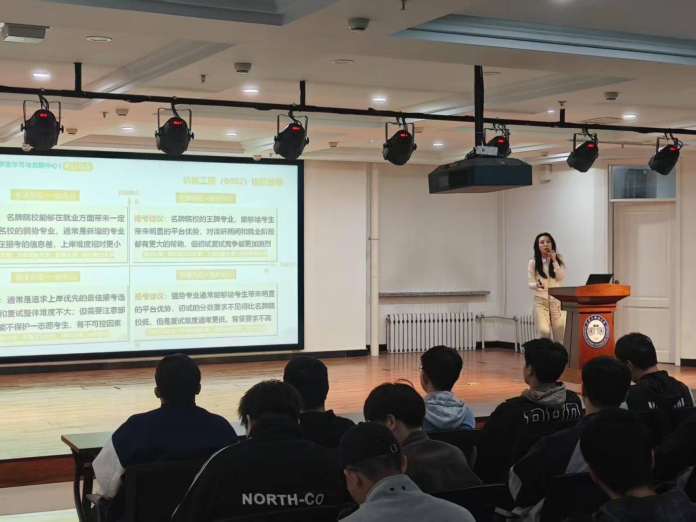 会上,任婧老师聚焦国家教育战略需求和学生个人成长需求讲授了为什么要考研,围绕“选择”“规划”“努力”“效率”四个方面介绍了如何科学备考,结合近年考研趋势、机械学科特点和学生自身实力讲解了应如何选择报考学校。