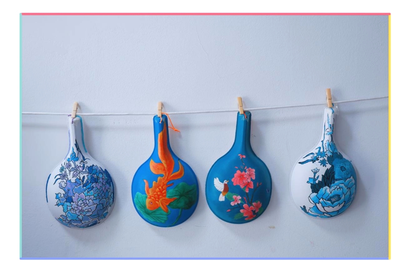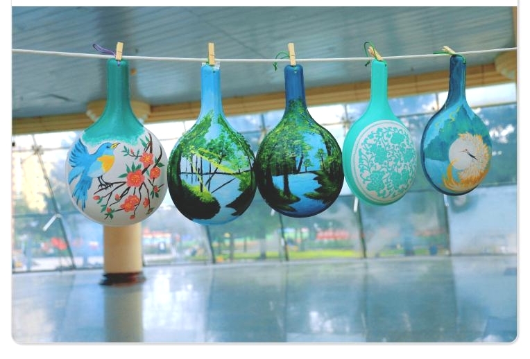 山水风景类作品则以马勺的弧形轮廓为天然边界,将水墨山水的空灵与西方绘画的光影技法相结合。作品以青绿重彩描绘层峦叠嶂,尽显山河壮丽;用淡墨勾勒出江南水乡的温婉秀丽。构图上,他们大胆突破传统山水绘画的布局,利用马勺的独特形状营造层叠的视觉空间,使观者在方寸之间感受大自然的磅礴与细腻。