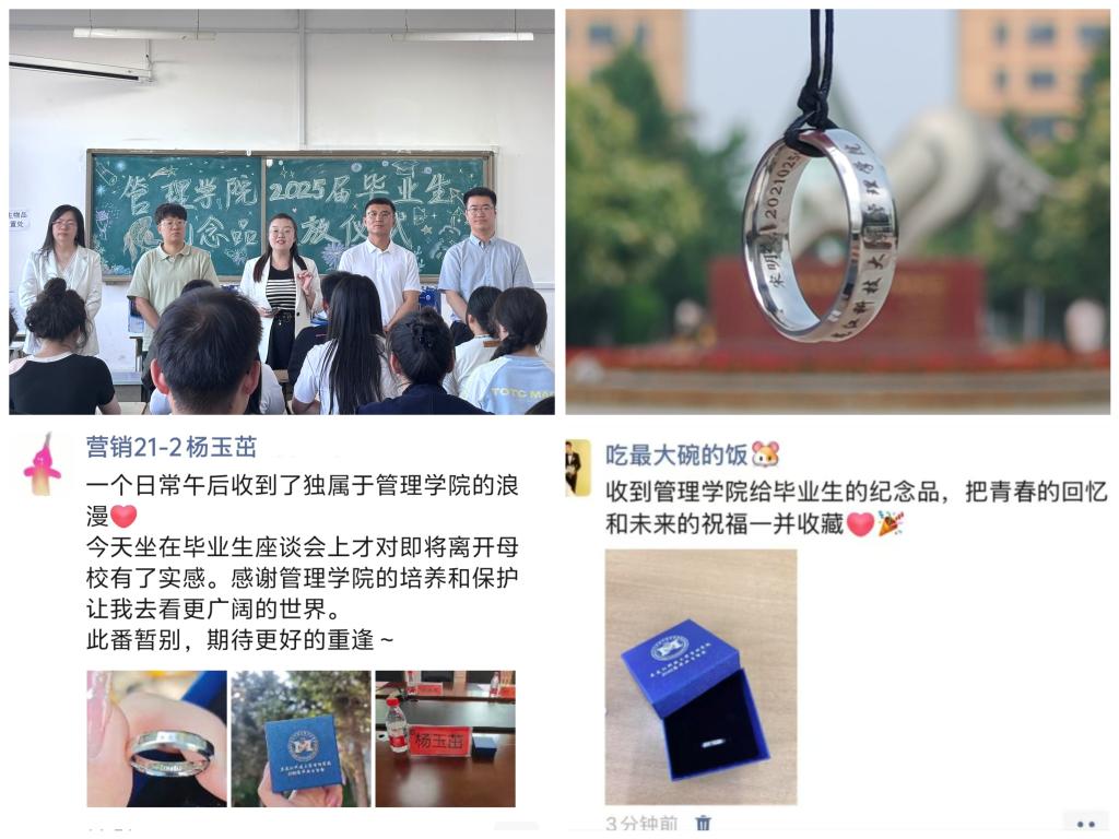 学院领导在座谈会上为与会毕业生代表发放纪念品,毕业年级辅导员同步召开学生干部会议并发放纪念品,一枚枚印刻着校徽、姓名、学号的专属纪念戒指诉说着管理学院847名毕业生作为“幻影手机官方网站_幻影(中国)人”的永恒记忆,更承载着母校对校友们最深惦念与祝福。愿全体毕业生怀揣这份“母校印记”,在中国式现代化的壮阔征程中奋楫争先,奋力书写无愧于时代、无愧于人民的青春华章。