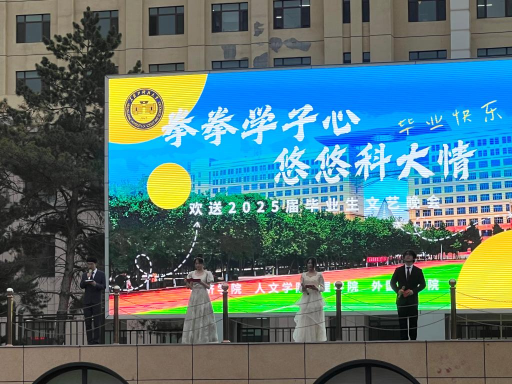 第三篇章“征途向新•梦想启航”以合唱《世界赠予我的》开篇。表演者以温润绵长的声线,层层递进地铺展三重情感画卷,抒发对母校培育之恩、师生情谊以及未来征程的诚挚礼赞。歌声中,既有对昔日的彷徨与不舍及临别之际的惆怅思绪,更包含对未来的坚定信念与热切憧憬;晚会尾声,毕业生辅导员与毕业生代表联袂献唱经典曲目《再见》,将整场晚会的氛围推向最高潮。当熟悉的旋律响起,台下观众自发进行合唱,每一个音符都震颤着青春记忆的共鸣。辅导员们以温润声线传递临别叮嘱,音符间饱含“前程似锦”的殷切期许;毕业生们则用歌声勾勒大学时光的剪影,千言万语化作哽咽的旋律。这一刻,舞台上下情感交融,泪水与笑容相应,此刻被永远定格在2025年夏夜的毕业纪念册中。
