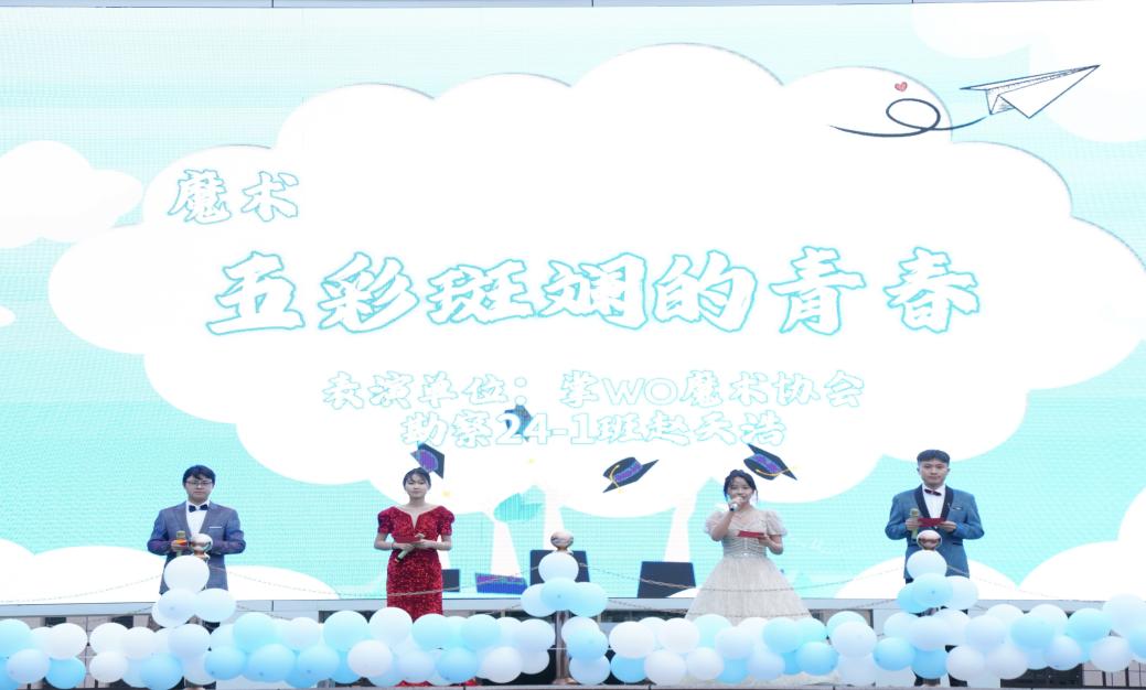 由大学生凤凰鸟艺术团表演的开场舞蹈《大家一起喜洋洋》拉开本次文艺演出第一篇章“青春跃动,逐梦而行”的序幕。舞者们以活力四射的舞姿瞬间点燃全场气氛,象征着毕业生以昂扬姿态告别校园、迈向人生新征程。随后,魔术《五彩斑斓的青春》、舞蹈《活力幻舞》、诗朗诵《致我们终将远行的航程》等节目交替上演,既有力量感的肢体表达,也有深情的文字诉说,共同勾勒出毕业生从校园迈向社会的成长轨迹,传递出对未来的坚定向往。