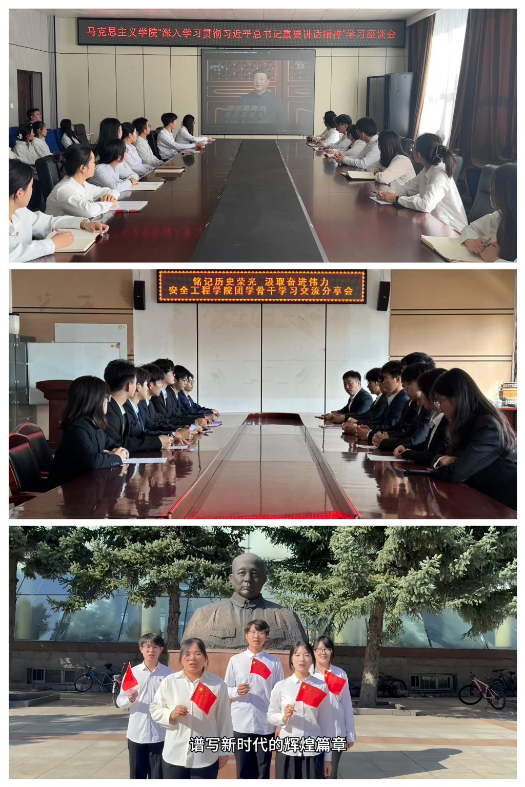 马克思学院团委组织青年学生深入学习习近平总书记在纪念中国人民抗日战争暨世界反法西斯战争胜利80周年大会上发表的重要讲话,引导同学们将伟大抗战精神转化为自身成长进步的强大动力。安全学院团委开展“铭记历史荣光,汲取奋进伟力”团学骨干学习交流分享会,教育引导团学骨干在铭记历史中凝聚奋进力量,更好地全心全意服务同学。管理学院团委组织青年学生精心录制《山川同歌》视频作品,同学们怀着崇敬与深情,将那段波澜壮阔、可歌可泣的东北抗联历史娓娓道来,表达对革命先辈的崇高敬意以及对祖国的深深热爱之情。