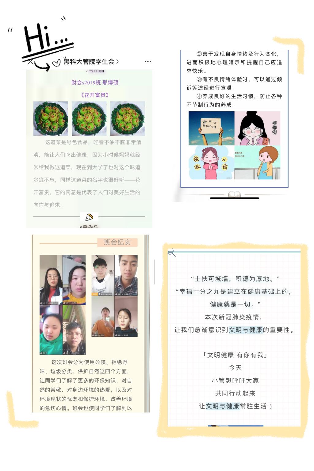 为积极倡导文明健康生活方式,弘扬时代新风,结合当前疫情防控新形势,管理学院进一步贯彻文明理念,倡导防疫期间保持身心健康,积极组织全院学生深入学习文明健康教育知识,集中开展了为期两周的以“文明健康,有你有我”为主题的云端文明健康建设系列活动,着力营造浓厚的关注、践行文明健康生活方式的氛围。