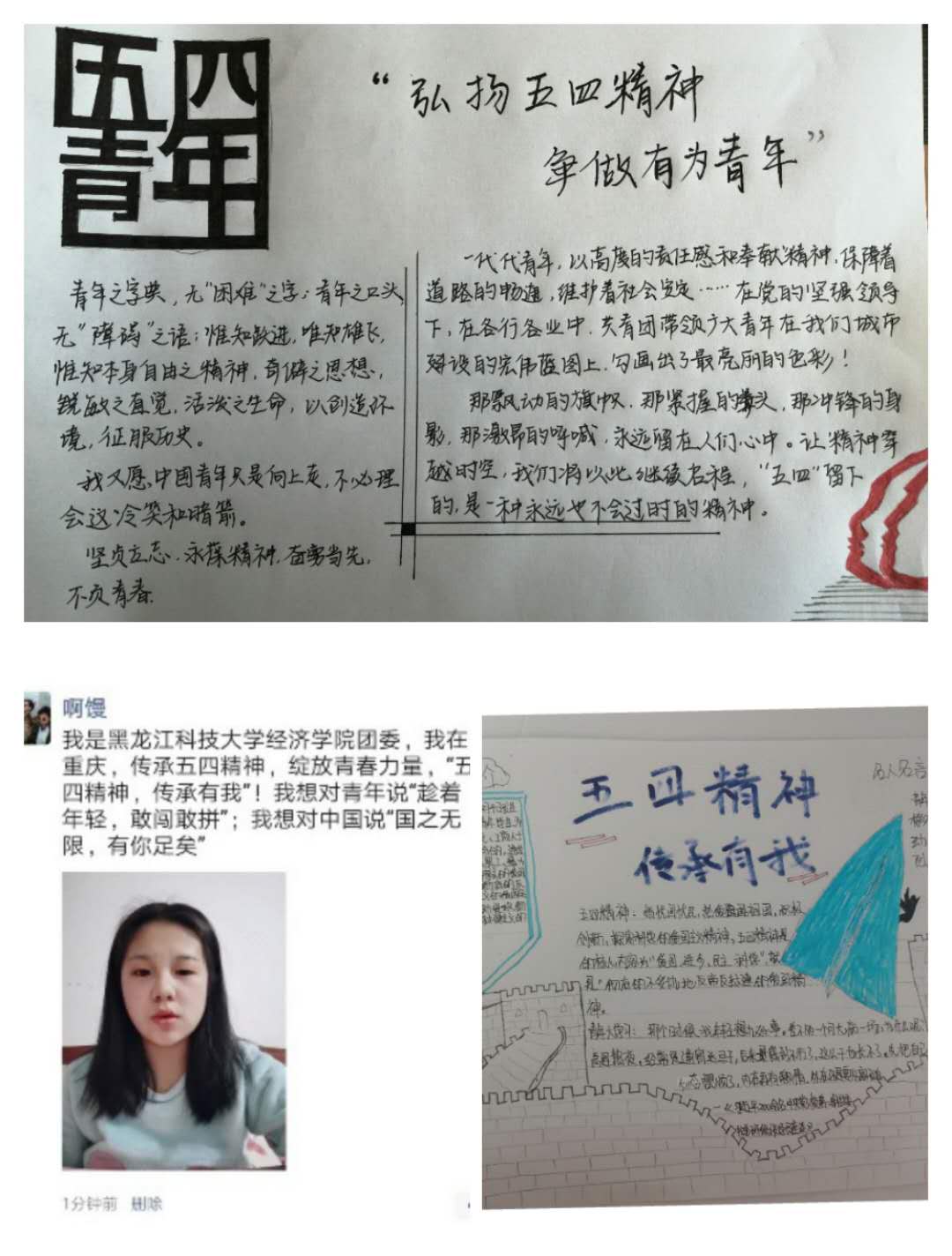 经济学院团委面向全体青年学生举办“五四精神·传承有我”全团网络主题传递活动,经济18-2班王旭航,经济19-2班高琳制作五四主题海报、国贸18-1班全体同学录制《五四,为青春喝彩》短视频、金融19-1班魏文琪录制歌曲为青春高歌,作品展示了广大青年积极向上、奋发有为的精神风貌。5月4日当天@共青团幻影手机官方网站_幻影(中国)委员会的微博、微信、QQ空间开设的#五四精神,传承有我#话题专区将作品发布,带动全体青年学生把炽热的爱国热情转化为强国动力,让五四精神常青。