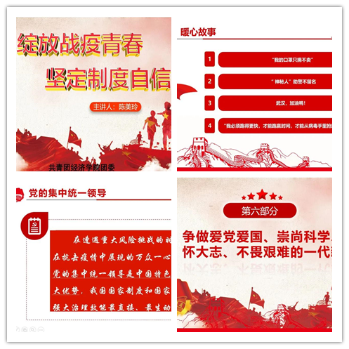 学院团委书记陈美玲以“绽放战疫青春·坚定制度自信”为主题,通过“经海拾贝”微信平台,为全体青年团员开展线上宣讲交流,通过战役暖心故事和身边最美逆行者典型事迹的讲述,引领青年学生深刻认识爱国主义精神实质和丰富内涵,引导全体青年学生深刻领会党的集中统一领导是中国特色社会主义制度的最大优势,激励和引领广大青年学生进一步坚定制度自信,增强“四个意识”,坚定“四个自信”,做到“两个维护”。