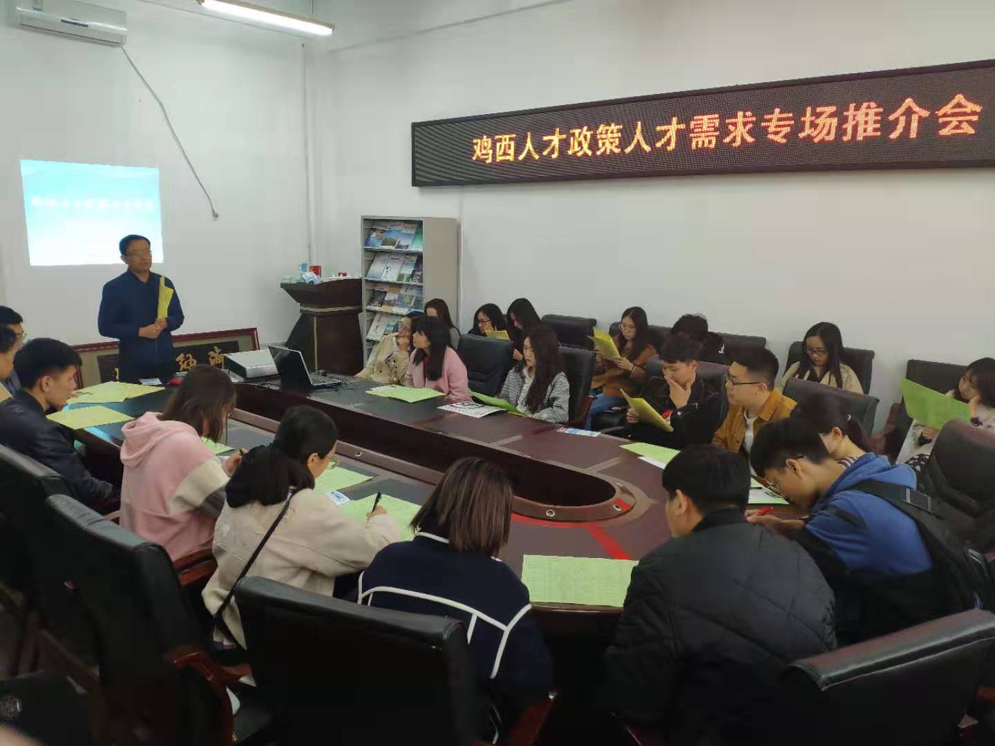 下午,鸡西人才办一行在科技大厦高层1010会议室举办了鸡西人才政策人才需求专场推介会。会议由辅导员侯树成主持。在推介会上,张强首先介绍了鸡西市关于吸引人才的优厚政策,包括:引进硕士人才在津贴待遇、周转编制、重点培养、职称评聘、创新创业、配偶安置、安居落户、医疗保健等方面的政策,又对此次招聘人才的事业单位和企业的情况进行了重点说明、针对学生们关注的待遇和编制问题做了解答。