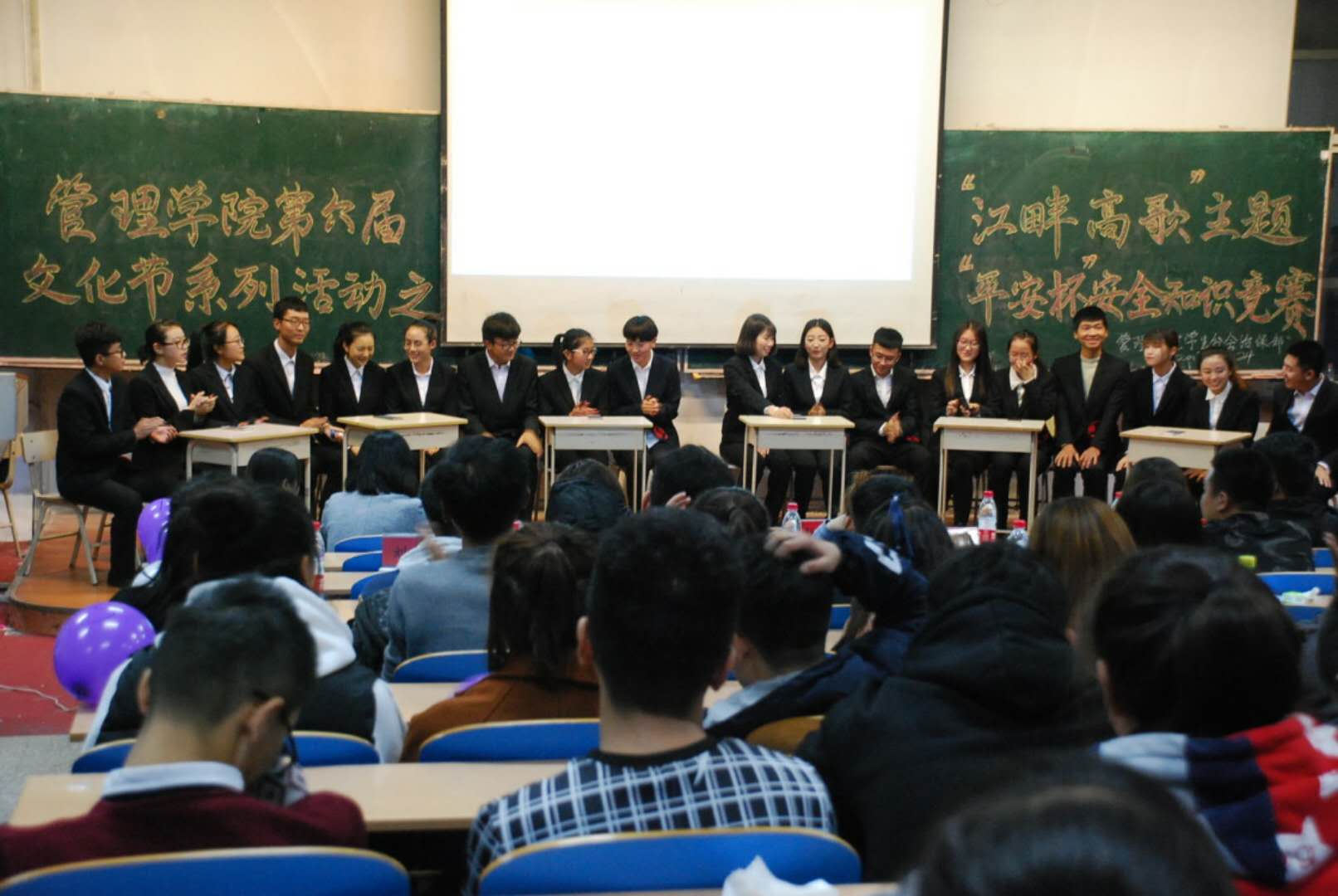 首先,管理学院学生分会治保部的成员们激情热辣的开场舞点燃了全场人员的热情。参与竞赛的17级选手分为6个小组,每组3人,共计18人。他们信心满满的走到台前落落大方的进行了自我介绍,之后比赛正式开始。比赛由必答题、抢答题、风险题和情景模拟题四个环节组成。选手们积极踊跃,竞争十分激烈。第三环节结束,两位十佳歌手为活动带来他们的礼物——歌曲《手心的蔷薇》。