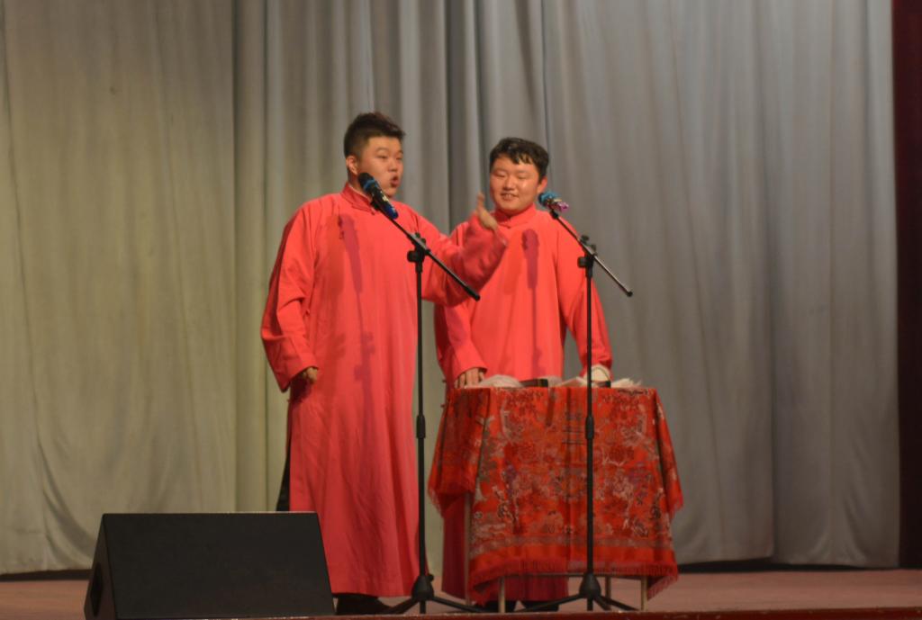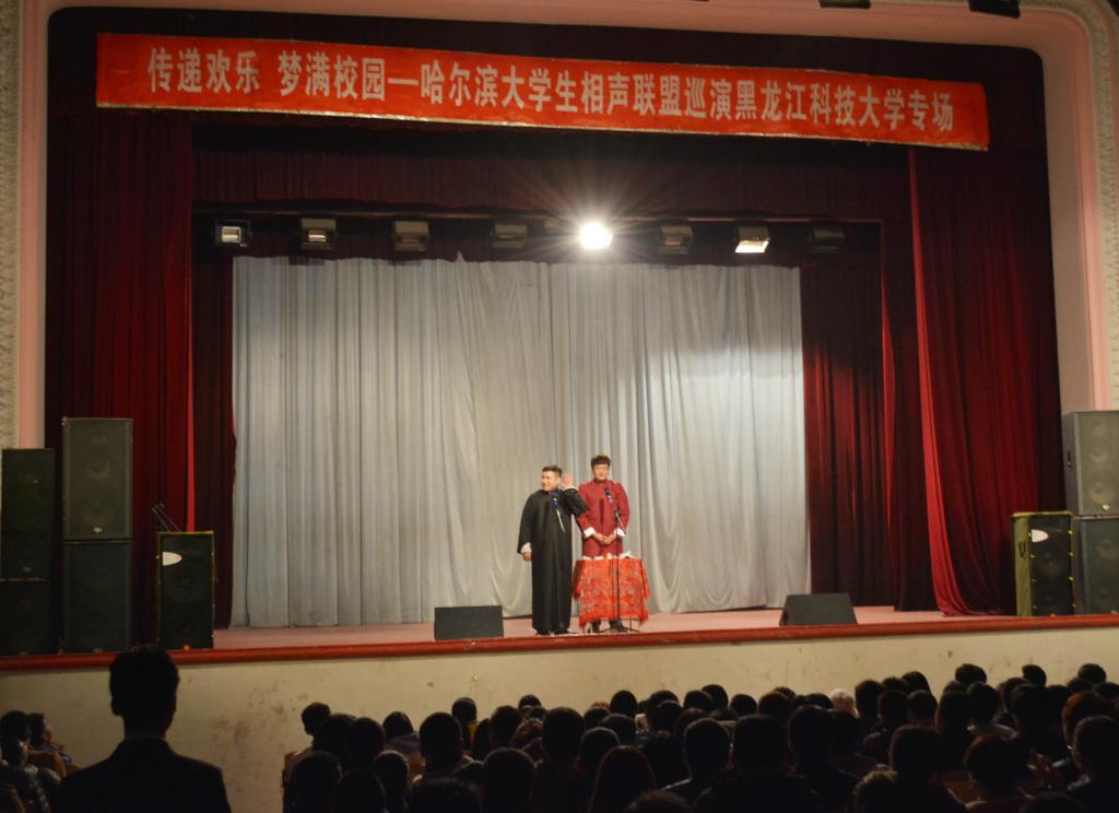 本次演出由哈市曲艺家协会那英琦、 冯玉丹两位老师助阵演出,来自12个在哈高校的相声爱好者倾情出演,包括中国传统绝技快板《立井架》、民间双簧《大双簧》和传统相声《欢声笑语》、《学外语》、《礼仪漫谈》等,既保留了传统相声的原汁原味,又融入了时代元素和校园生活,展现了相声艺术的独特魅力,深受现场师生的欢迎。整场活动高潮迭起,笑声不断,通过相声演员的精彩表演,提升了青年学生对我国优秀民族文化的自豪感,通过艺术的手段不断引领启发着现场观众对生活、学业的思考,返场的呼声响彻现场。