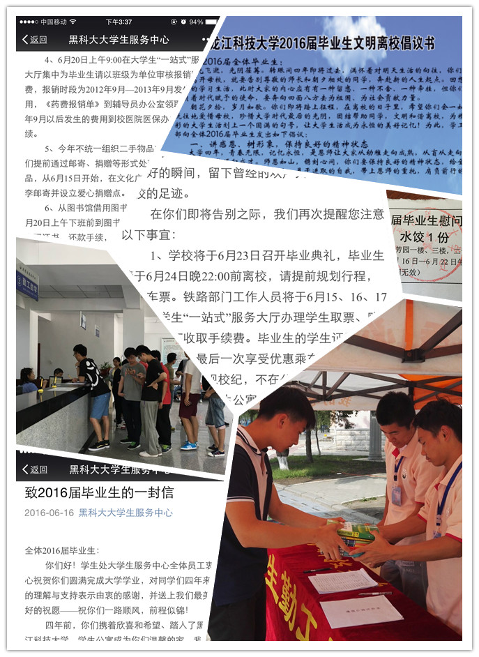 以生为本,为生尽责。学工部协调协作相关单位,以“简化程序、便捷手续、周到热情、贴心服务”为主旨,找准职责职能与服务学生的最佳结合点,用增加自身职责的“加法”换取毕业生离校的“减法”。学生处通过公众微信平台向全体毕业生推送了《毕业生文明离校倡议书》、《致2016届毕业生的一封信》,将学校系列教育服务工作面向全体毕业生发布。进一步简化了离校手续办理流程,将内容由4项减为2项。联系哈尔滨市邮政局、中铁快运入校为毕业生提供行李邮寄服务,协调铁路部门到校为毕业生提供购票、取票服务。后勤处为每名毕业生提供了送行水饺,6月23日、24日,学校将提供免费送站车欢送2016届毕业生,让毕业生感受到如同4年前来校报到时一样的温馨。