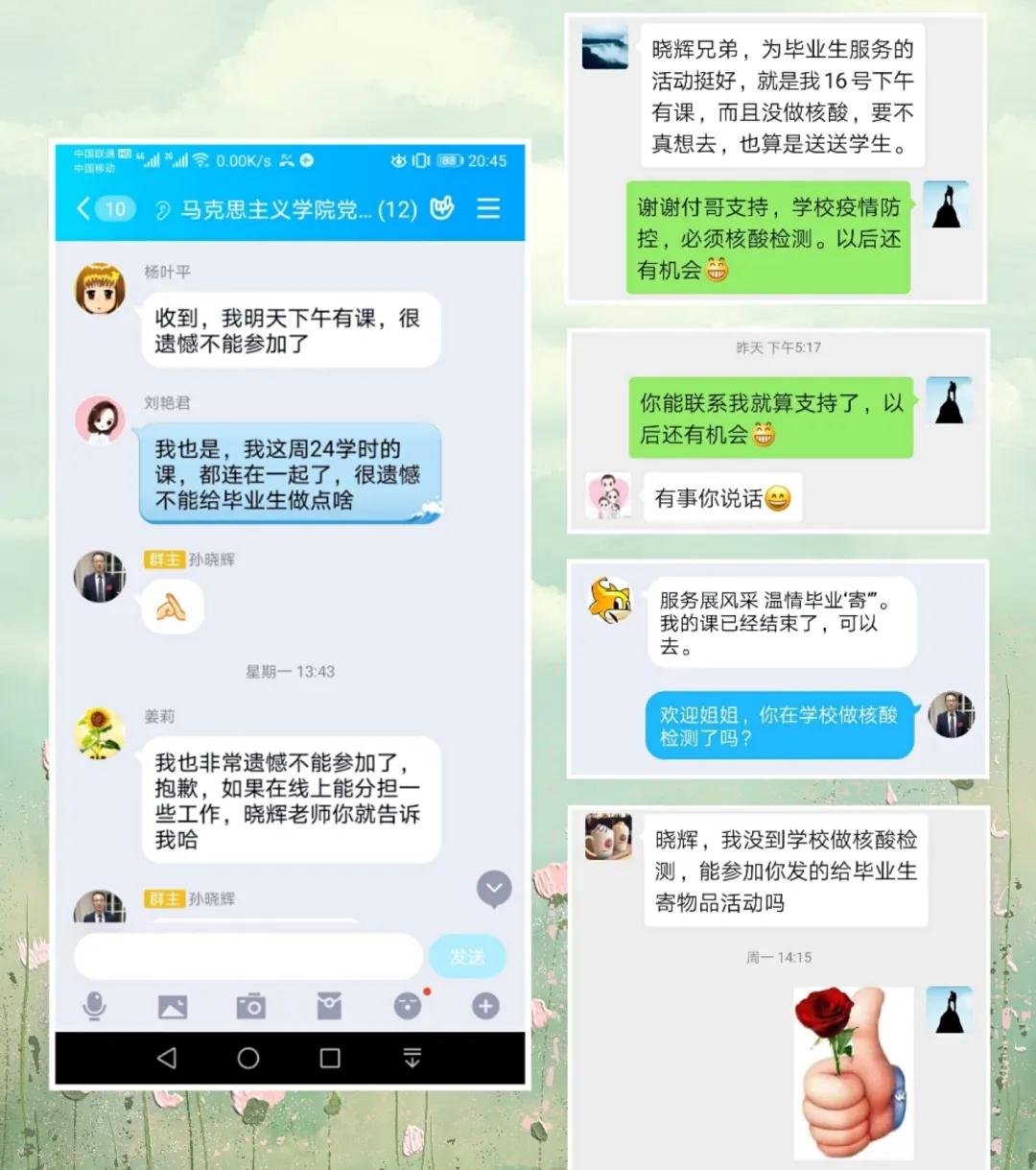 以生为本,为生尽责。疫情无情人有情,马克思主义学院的老师们用实际行动让奉献的温暖穿越“云”端,让师生的情谊不断升华,如汩汩暖流送达到每一名毕业生的身边,展现了“大德 和谐 共进”的学院风貌,让党旗在疫情防控和为毕业生服务的实际行动中高高飘扬。