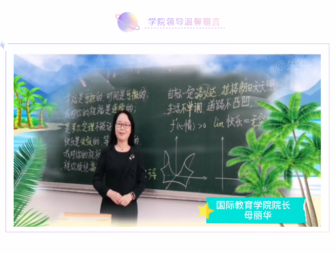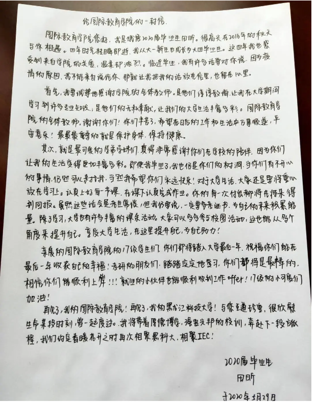 国际教育学院积极关注每个毕业生的成长和发展,将毕业生教育作为学生知识学习和健康人格培养的重要阶段,立足温馨、温暖、温情的角度深入开展了2020届毕业生主题教育系列活动,进一步激发了全体毕业生的爱校荣校热情,为毕业生留下美好记忆的同时引导毕业生体会成长、学会感恩,也为特殊时期的毕业季校园文化增一道亮丽色彩。