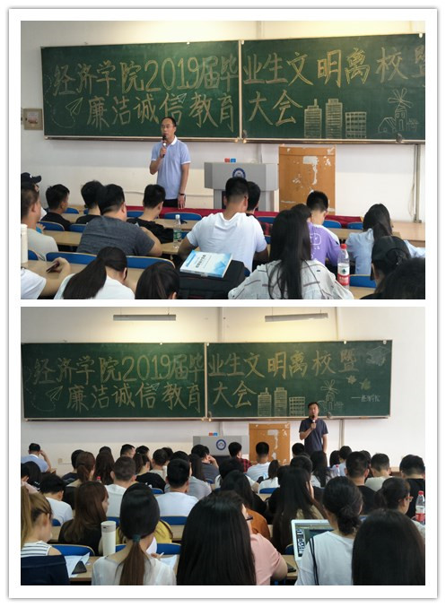 为增强毕业生的母校情结和感恩意识,营造“安全文明、和谐有序”的校园氛围,引导毕业生树立爱岗敬业的职业观念、培养自重自律的廉洁意识,经济学院于6月12日上午,在主楼ws0303召开了2019届毕业生文明离校暨廉洁诚信教育大会。经济学院党委副书记贺龙军出席了本次会议。