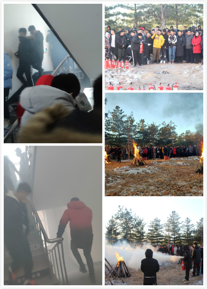 活动分为安全撤离、灭火演习、安全教育三部分。工作人员在学生二公寓一楼引燃了烟雾弹,并立即拉响警报,各楼层学生在辅导员、班主任的指挥下,采取有效防护措施从低到高依次按照预定逃生路线安全撤离,1300名学生紧张有序、迅速高效的撤离到了“安全区”。2019级全体同学及各年级学生代表在网球场旁的空地集合,进行灭火演习和消防安全教育,保卫处孙健老师对干粉灭火器的原理、使用方法、注意事项等方面向全体同学进行讲解,徐长明老师讲解了消防安全基础知识、基本方法和逃生技能,随后各班级学生代表进行了现场灭火操作。
