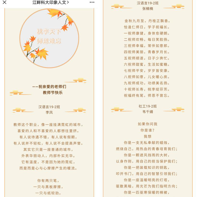各专业的学生们将对老师的浓浓感激、美好的祝愿藏于字里行间。“如春风化雨,润物无声。桃李不言,灼灼其华”,这是汉语言19-2班的杨慧怡理解的老师;“你是一支无私奉献的蜡烛,燃烧自己,用热血的青春培育我们”,这是社工19-2班韦千婧的感激;“它有温度,不是因为她的霓虹,而是心与心摩擦产生的暖流”,这是汉语言19-2班李凤对师生关系的理解……同学们用笔挥写感激,用心缔造情谊,这不仅是人文师生情谊的美好体现,更是人文学院一直以来致力于弘扬美好传统美德的传承。