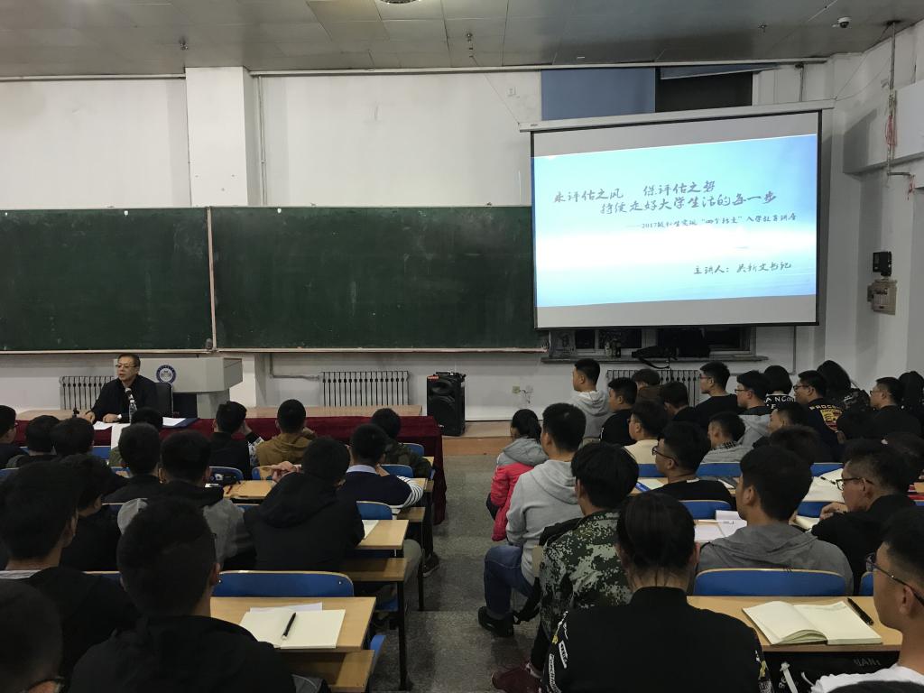 在总结前几届新生入学教育经验的基础上,机械工程学院2017级新生入学集中教育以系列讲座的形式完成。七个讲座旨在迅速提升新生对母校以及所选专业等方面的认知度,明确大学奋斗目标,达到提高人才培养质量的教育目的。入校近一个月来,已经完成了五个专题讲座,分别为学工办主任毕强老师讲解日常行为管理规范、综合办马艳萍老师讲解学籍管理规定、学工办郝鑫老师讲解职业生涯规划、五位专业带头人分班讲解专业介绍、刘元林副院长讲解审核评估专题知识。恰逢专家入校,作为审核评估的重要时期,9月28日晚,机械工程学院党委副书记吴新文围绕关于大学的“四个转变”,为2017级新生做了一场名为《乘评估之风,保评估之势,持续走好大学生活的每一步》的精彩讲座。