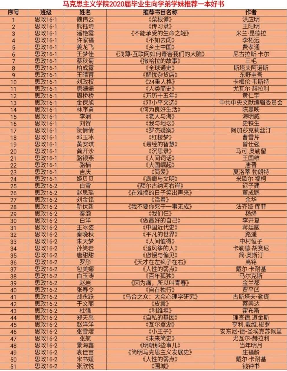 为深入贯彻落实学校下发《2020届毕业生主题教育活动安排意见》,营造毕业季的浓情氛围,充分抒发毕业生们情系学校、薪火相传的真挚情感。马克思主义学院于5月20日在全体51名毕业生中组织开展了向学弟学妹推荐一本好书活动,得到了全体毕业生的积极响应。