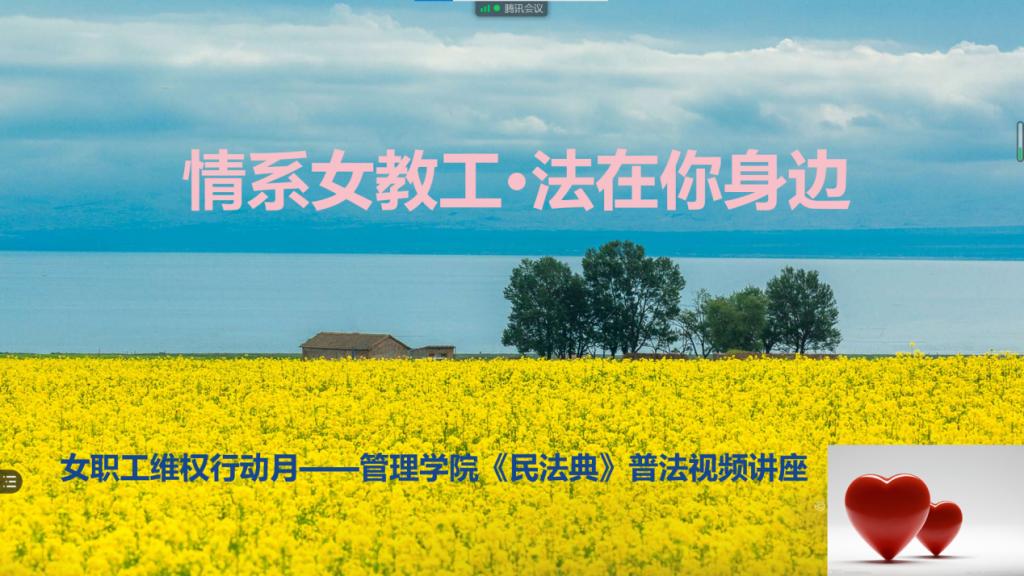 为深入贯彻落实省教科文卫体工会和校工会的工作安排部署,切实把普法工作做实做细,3月15日,管理学院工会通过腾讯会议形式开展了“女职工维权行动月——《民法典》普法视频讲座”活动。
