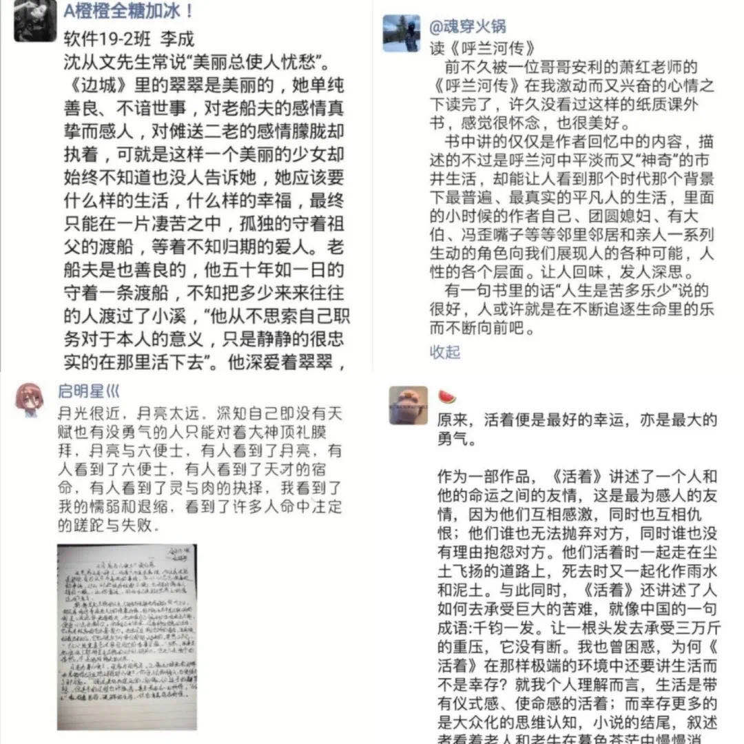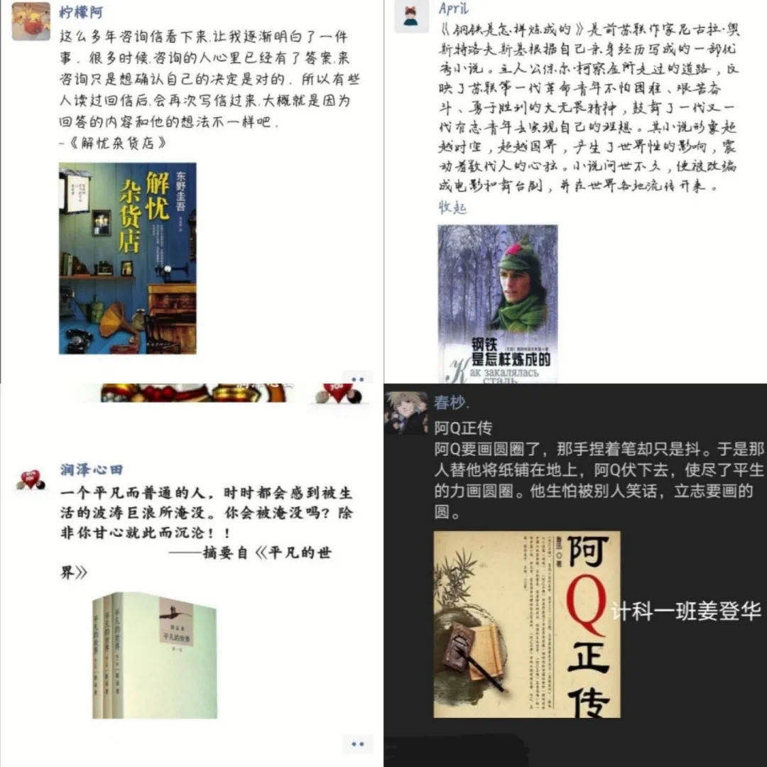 本次“疫”期“云阅读”读书分享会活动,很好地激发了全院的读书热情,在号召大家多读书、读好书,培养阅读的兴趣的同时,也营造了良好的学习氛围,推进了学风建设。同学们纷纷表达读书的魅力所在, 那就是读书可以给学习带来非凡的动力,可以饱满精神和信仰,可以历练坚强意志。