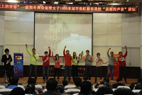 整场活动以访谈的形式进行,张虹讲述了一组组照片背后的故事,为我们讲述了自己从7岁开始滑冰,18年来不畏艰辛、奋力拼搏的故事。和我们分享了为中国夺取了冬奥会历史上的第一枚速度滑冰金牌的激动和骄傲。通过访谈的进行,在场师生真切感受到了一名运动员代表国家取得赛事最高荣誉的那份自豪,和背后所付出的磨难、艰辛与超乎常人的执着。张虹的真诚大气、阳光心态以及勇于拼搏的精神打动了在场每个人,她说“我每天、每个月、每个季度都会给自己设定一个小目标,只有做好每天的事情才会有未来”,“我很幸运在自己最困难的时候没有放弃,而是一直在坚持”,最朴实的话语道出了长期的坚守与执着。她对同学们说一定要珍惜在校的每一天,珍惜这么好的学习环境,现在的每一个积累都会为今后的成功做下铺垫。当谈及训练的枯燥和给身体带来的伤痛时,她说“既然选择了就要有责任感”,“虽然训练很痛苦,但怎样都是一天,为什么不开开心心的过呢,我就是队里的开心果”,“都说痛并快乐着,但我是累并幸福着,有追求、有目标、有梦想,才幸福”。当谈及获得索契奥运会冠军颁奖环节时,她说“看着五星红旗在最高的地方升起,内心充满了神圣感和自豪感”,她在颁奖台上行的军礼令人难以忘怀,张虹说这枚金牌的获得不只属于她一个人,而是属于所有前辈、所有速滑队员和关心速滑事业人们。她很感恩国家、感恩大家,这种家国情怀和感恩态度令在场师生动容。