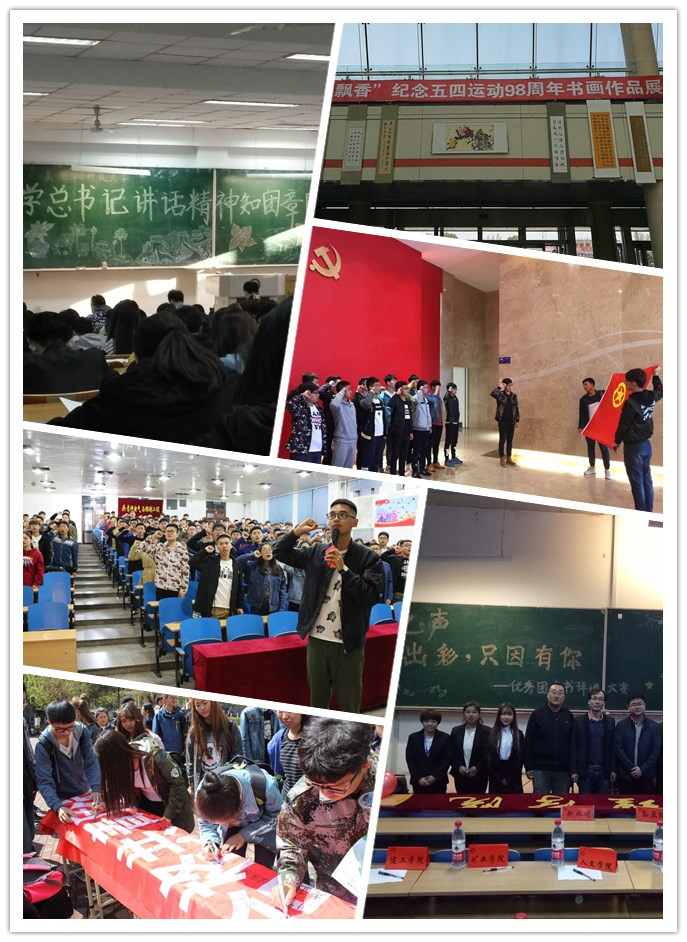 近一段时间以来,全校各级团组织围绕纪念五四运动98周年、建团95周年开展了形式多样、内容丰富的系列纪念活动。校团委先后举办了“弘扬五四精神、争当时代先锋”主题团日、“翰墨飘香”纪念五四运动98周年书画作品展、“学总书记讲话,知团章团史”知识竞赛、“学习总书记讲话,做合格共青团员”旗帜杯征文比赛、升旗仪式等活动。各学院也围绕五四运动98周年、建团95周年积极开展多种形式的纪念活动,矿业学院、安全学院、电气学院、经济学院、人文学院、研究生学院举办了重温入团誓词仪式教育活动;机械学院、建工学院、国教学院、外国语学院、管理学院分别举办了事迹宣讲、文艺演出、线上推送、知识竞赛、优秀团支书评选等系列活动;环化学院、电信学院、材料学院、计算机学院、理学院将举办纪念五四运动98周年表彰大会等纪念活动,在全校范围内掀起了用五四精神点亮青春奋斗之路的热潮。