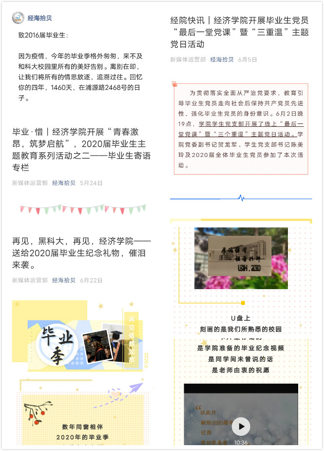 学院以“青春激昂 筑梦启航”为主题,相继开设“情系母校,乘帆远航”毕业生寄语专栏、开展“4年,1460天,幻影手机官方网站_幻影(中国)记忆”、“殷殷母校情 依依学子心”文化作品征集、毕业生PS“云合影”、“写给十年后自己的一封信”、最后召开一次“云”班会、线上“最后一堂党课”暨“三个重温”主题党日等活动,“云端”开展的系列主题教育活动,为不能返校的毕业生搭建了记忆的平台,抒发了毕业情怀,共同回忆了四年的美好时光,营造了毕业季的良好文化氛围。