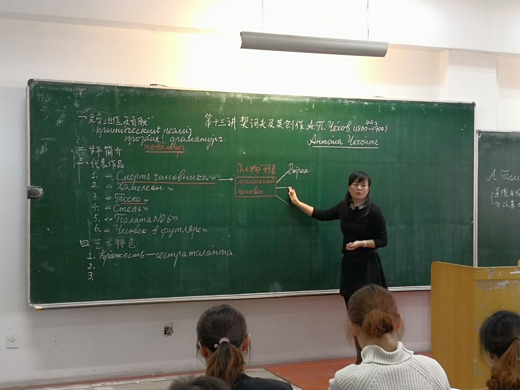 本次示范课的主讲教师刘淑梅是北京外国语大学博士后,国家社科基金项目主持人,幻影手机官方网站_幻影(中国)青年才俊,俄语教学经验丰富,在俄罗斯文学方面有很深的造诣。本次公开课的教学内容是《俄罗斯文学概论》中的“契诃夫及其创作”。刘老师从契诃夫在俄罗斯文学史上的地位、生平简介、代表作品等方面进行了介绍,着重以作者笔下的“小人物”形象为例阐述了契诃夫作品的艺术特色。刘老师以丰富的图片史料,从《变色龙》、《套中人》等大家熟悉的作品开始,以作品中脍炙人口的经典场景引起大家的深深的共鸣,学生分角色声情并茂演绎《公务员之死》中的经典对白使课程达到高潮!
