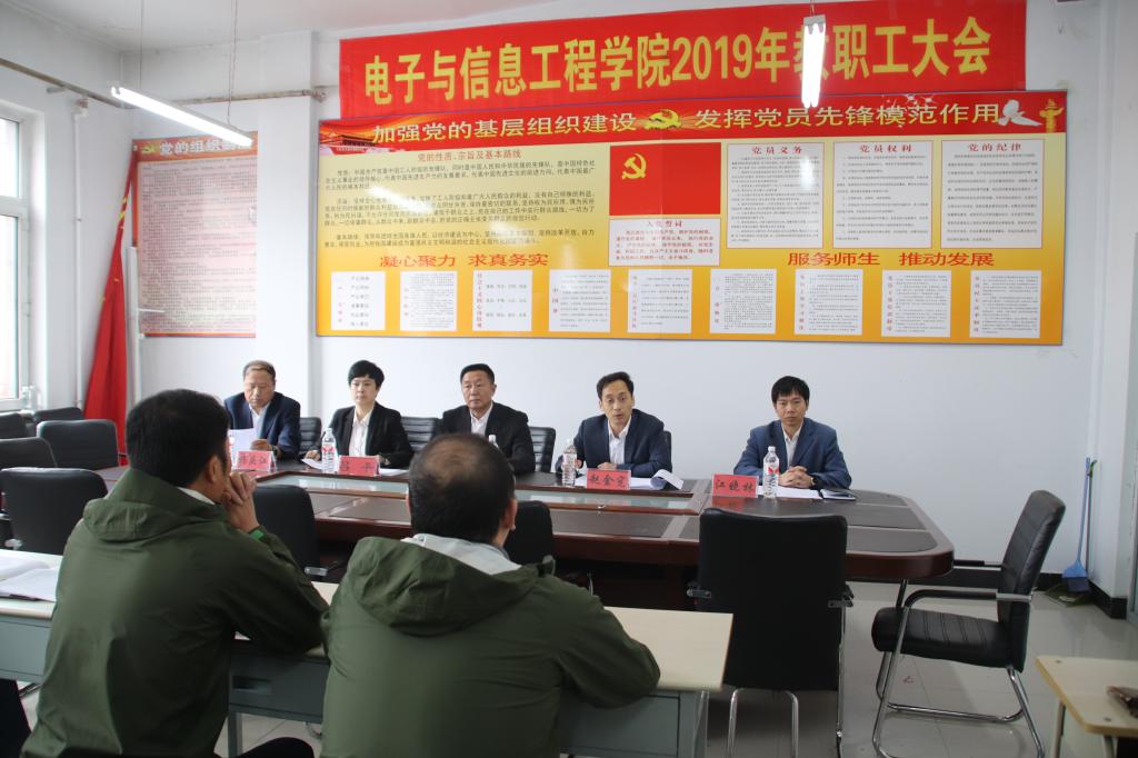 院党委书记贺启印作了《凝心聚力谋发展砥砺奋进谱新篇努力开创电信学院内涵建设发展新局面》的讲话,讲话充分肯定了全院教职工的主人翁精神、民主管理与监督的责任意识、为学院人才培养的奉献担当以及大会取得的成果,为贯彻落实好学校一届四次教代会和本次教职工大会精神,完成好学院2019年工作提出三点意见,一是聚焦党的政治建设,加强党的全面领导,二是聚焦学院事业发展,推动内涵建设高质量发展,三是聚焦全年工作任务,全面落实会议精神。并号召学院全员上下要凝心聚力,团结一致,不断提高人才培养质量,推动学院内涵建设发展,为学校建设特色鲜明的高水平应用型大学做出新的贡献,以昂扬奋进的精神面貌和突出的贡献迎接新中国成立70周年!