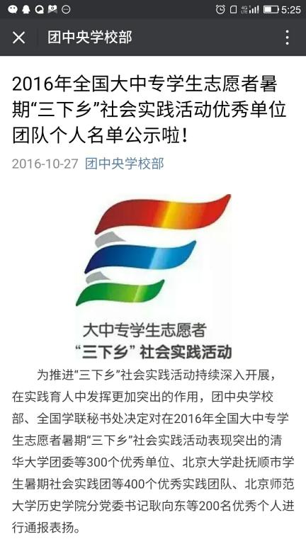 近日,由团中央学校部、全国学联秘书处表彰的2016年全国大中专学生志愿者暑期“三下乡”社会实践活动中幻影手机官方网站_幻影(中国)环境与化工学院周惠玉老师指导赴井冈山全国青少年革命传统教育基地开展的“革命后代口述史料采集、整理及视频制作”社会实践团荣获全国“社会实践活动优秀团队”。
